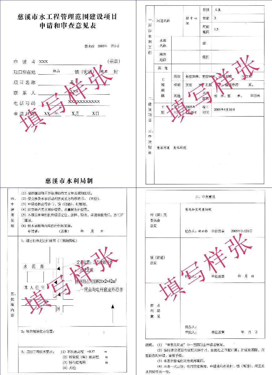 申报单位(个人)到市行政服务中心水利窗口申请(或者登陆慈溪水利网,在网上申请)→窗口受理→行政审批科会同现场踏勘、技术审查→审批发文→申请人到窗口缴费并领取批文。 |